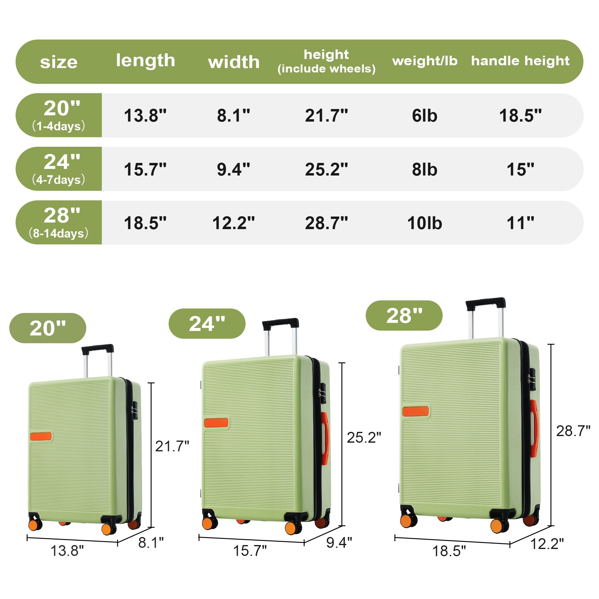Note: The color block on the surface of the luggage is marked with a Brand Logo-"merax" design.Please be cautious when listing.Instructions for Reset the combination lock1.The lock is Pre set to 0-0-0;2. Push the button on the broadside, while in this position, set each number to your preference;3. Release the button and your combination is now set;4.Take care when setting the numbers to not release the button while setting it.Specifications:Approx.Dimension(including wheels)--Approx. Weight20 INCH--21.7" x 13.8" x 8.1"--6 LBS24 INCH--25.2" x 15.7" x 9.4"--8 LBS28 INCH--28.7" x 18.5" x 12.2"--10 LBS