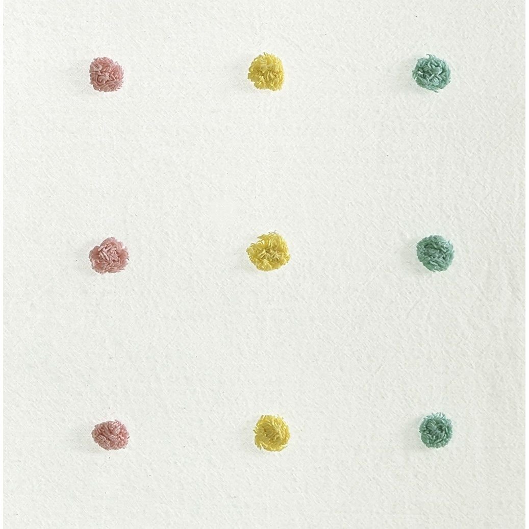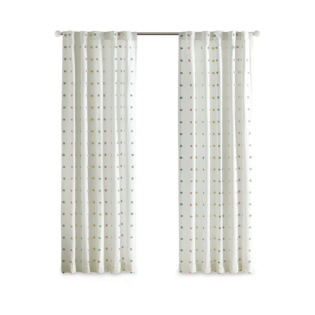 Brighten up any bedroom with the Intelligent Design Callie Cotton Jacquard Pom Pom Window Curtain. The 100% cotton window panel features multi-colored jacquard pom poms against a soft white ground, adding a fun texture and bold pop of style to any space. This window panel is also OEKO-TEX certified, meaning it does not contain any harmful substances or chemicals, ensuring quality comfort and wellness. Panel is finished with a rod pocket top or back tab for easy hanging and machine washable for easy care. Coordinating bedding is available and sold separately.