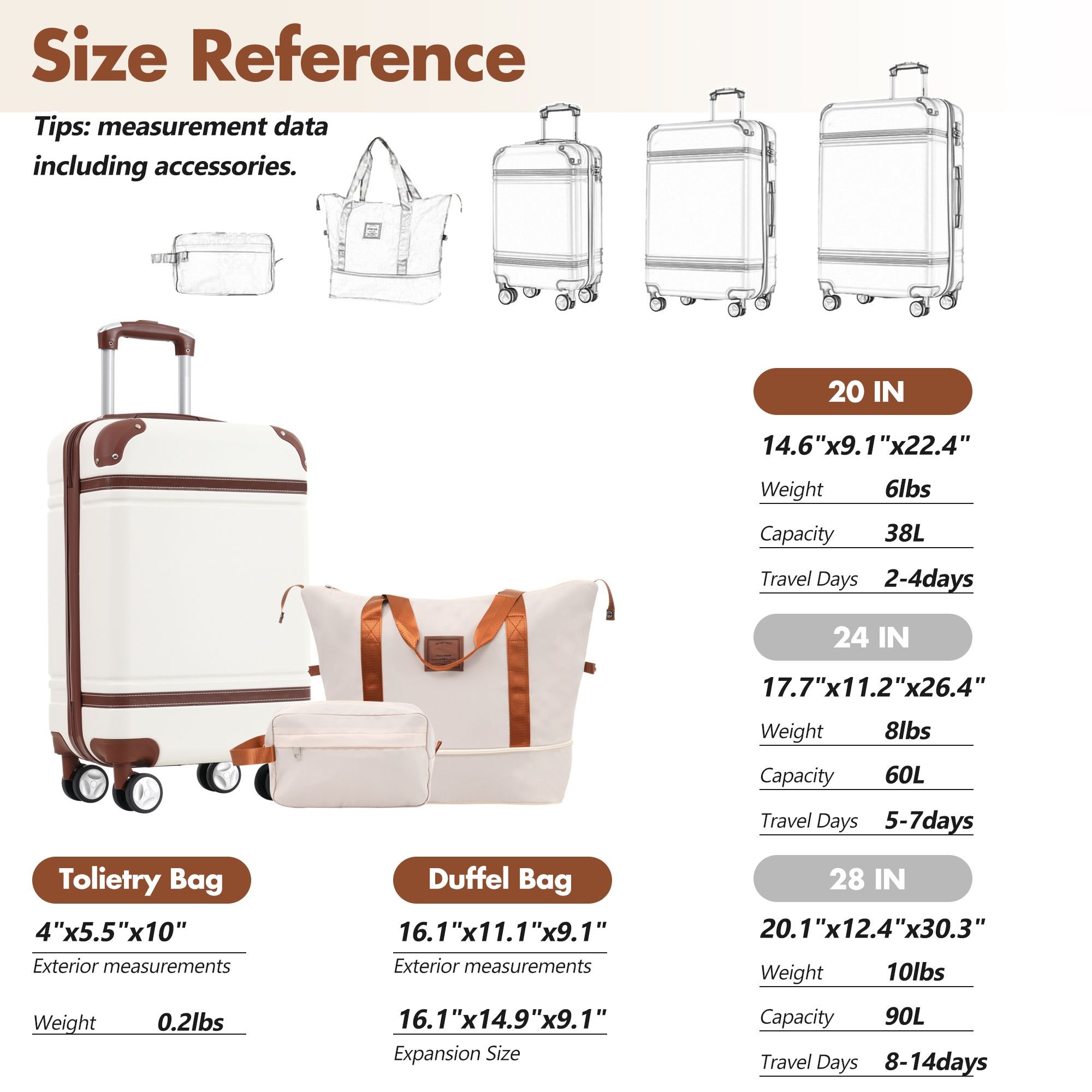 Size:20 IN carry-on luggage dimensions(included accessories): 14.6"x9.1"x22.4"; Expandable travel bag dimensions :longest length: 23", shortest length: 16.1", width: 9.1", height(without extension): 11.1", expansion part height: 3.8";Toiletry bag dimensions: 10 "x5.5"x4".