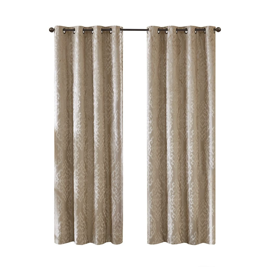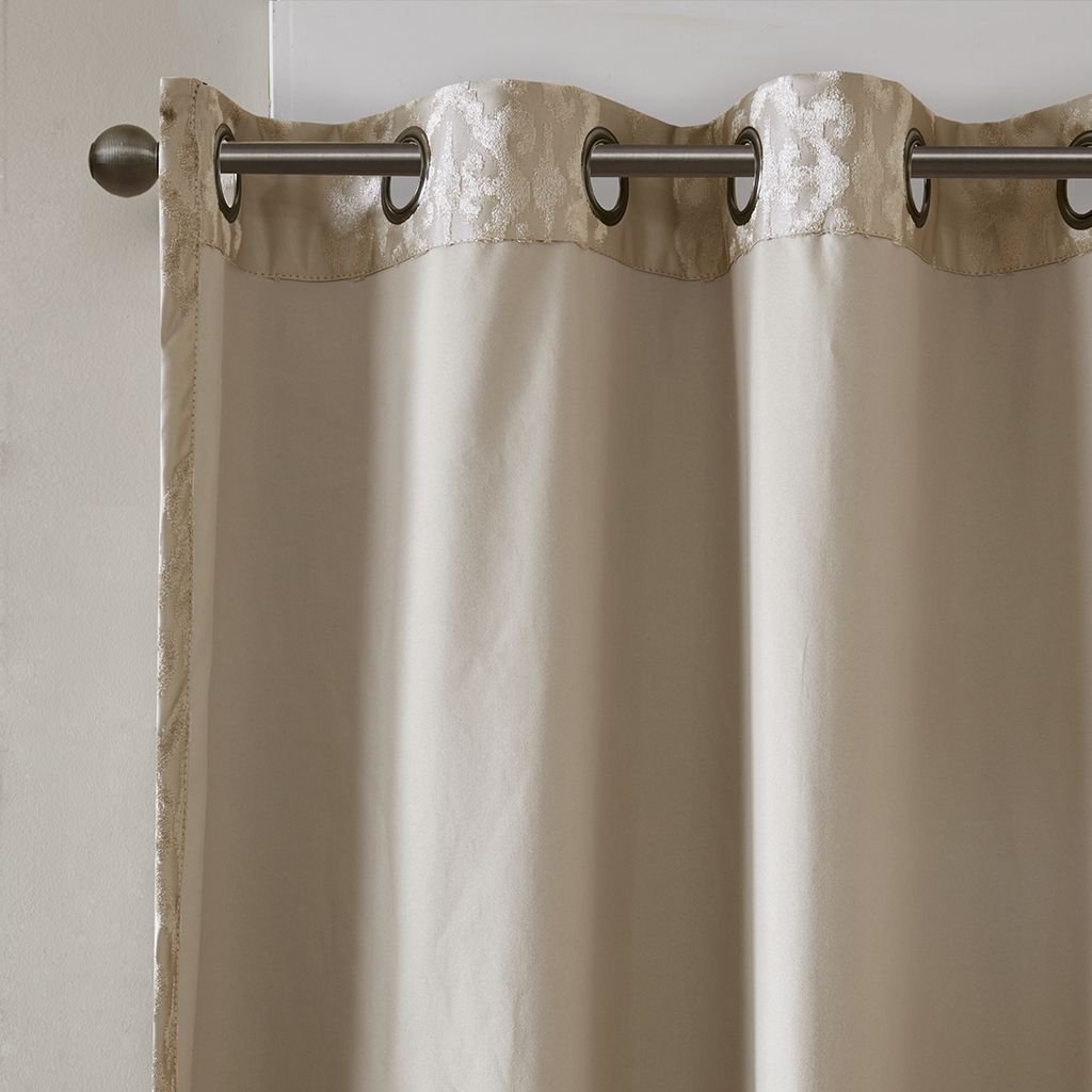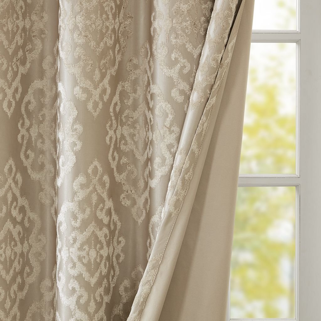Give your home the lavish style and energy efficiency it deserves with our SunSmart Mirage Knitted Jacquard Total Blackout Panel. This elegant window panel flaunts a knitted jacquard damask design in a rich champagne hue, creating a luxurious sheen and texture. The heavyweight fabric features a foam-back and bonding finish that blocks out all sunlight and provides a maximum protective barrier against noise intrusion. With 100% total blackout properties, this window panel offers a maximum level of privacy and energy savings, which makes it perfect for bedrooms, media rooms, or any private spaces. A gunmetal grommet top detail completes the look, while also making it easy to hang, open, and close the window panel throughout the day. Fits up to a 1.25' diameter rod. Lighting level: Pitch Black Ambiance.