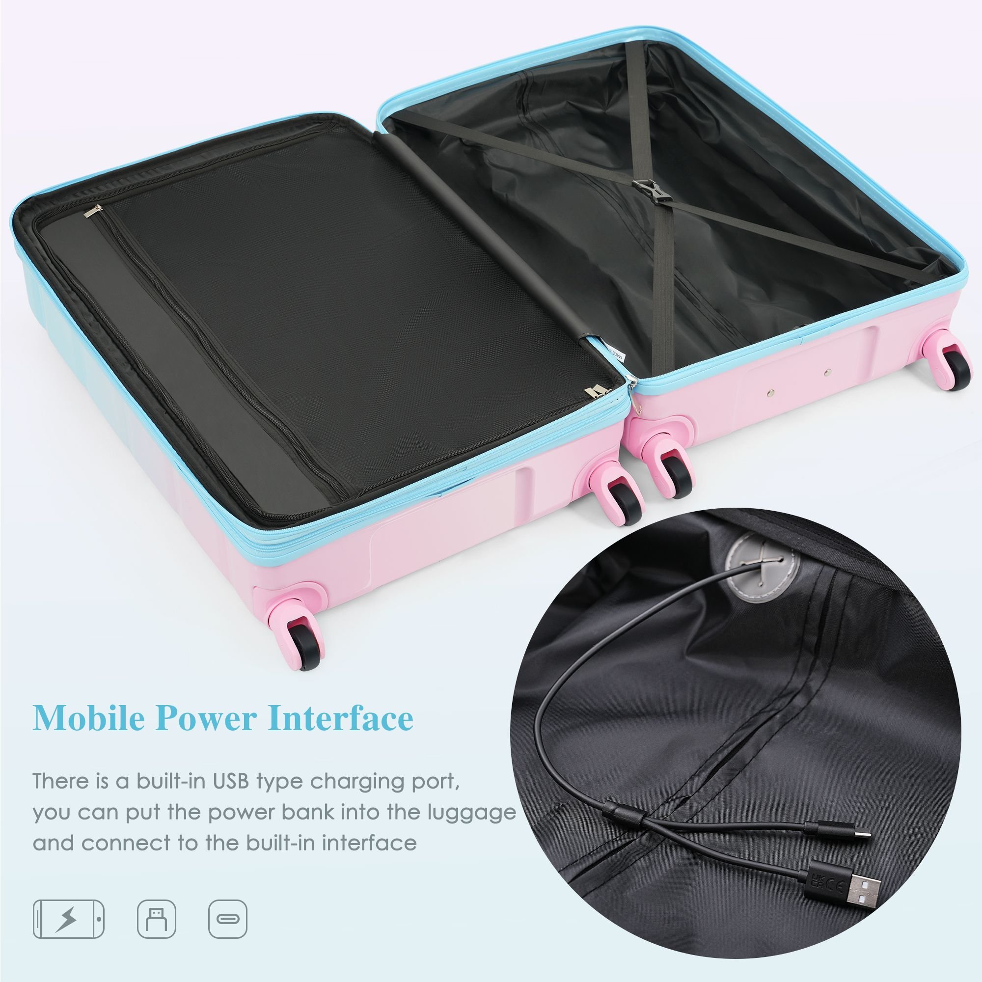Home > Luggage Set of 3, 20-inch with USB Port, Airline Certified Carry-on Luggage with Cup Holder, ABS+PC Hard Shell Luggage with Spinner Wheels, light blue