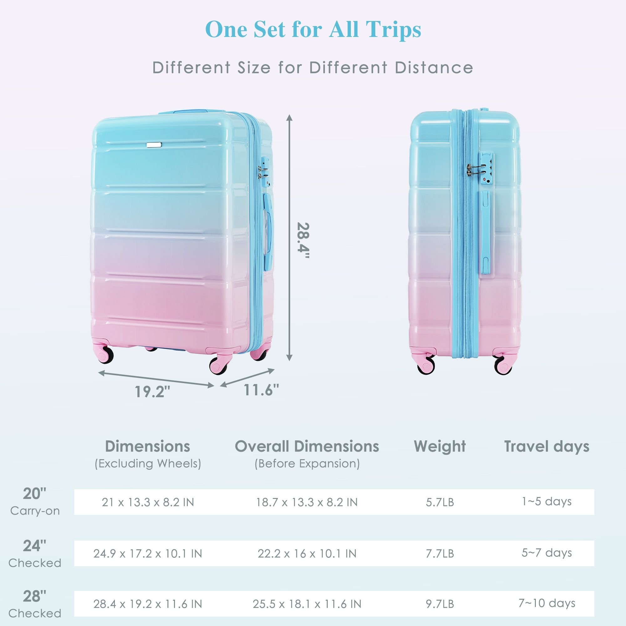 [High Quality Luggage Sets]Made from extra strong ABS+PC material, which is lightweight and extremely durable. Features textured finish to prevent against scratches,keeping lightweight luggage set beautiful trip after trip.
