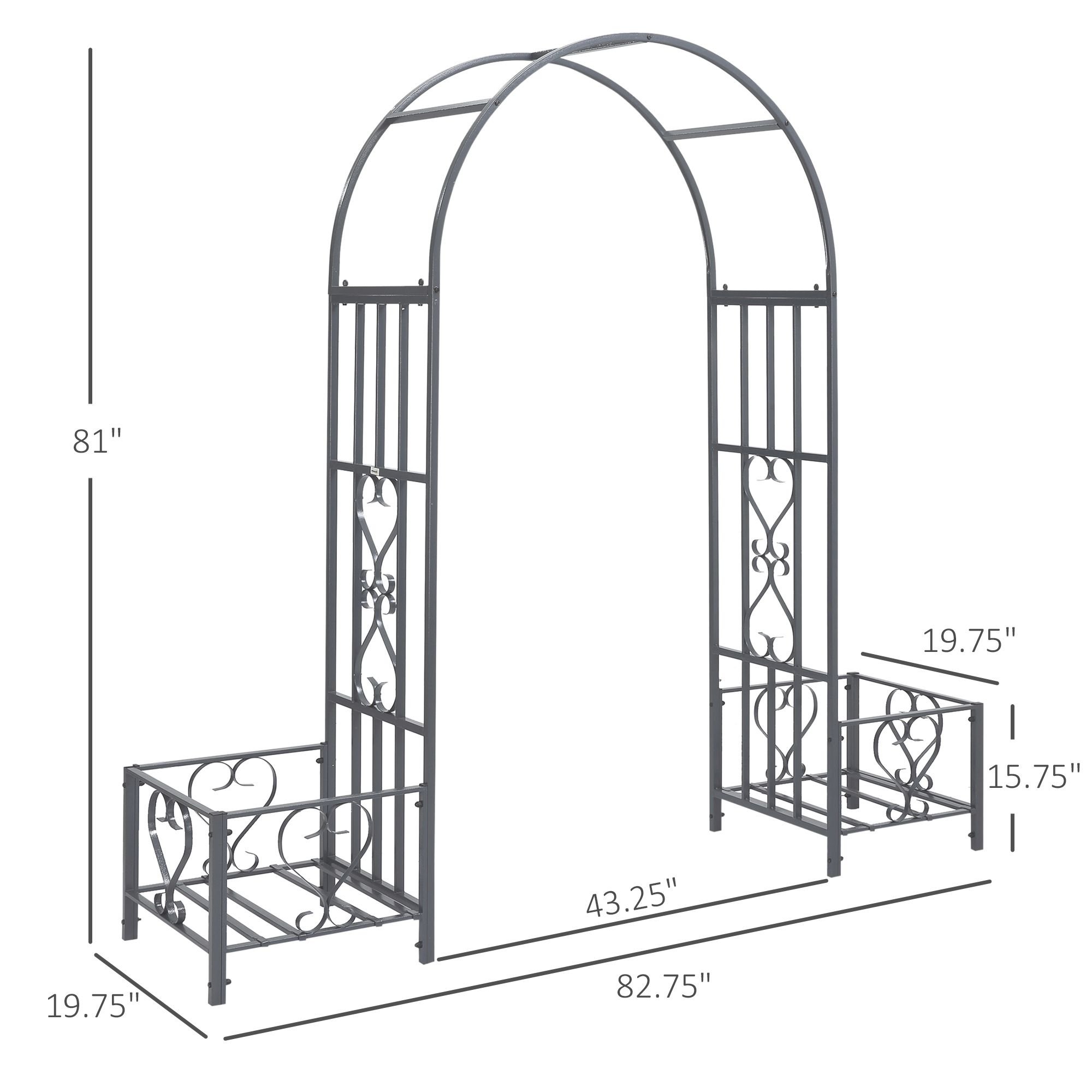 Outsunny 6.7' Steel Garden Arch Arbor with Scrollwork Hearts, Planter Boxes for Climbing Vines, Ceremony, Weddings, Party, Backyard, Lawn, Dark Gray