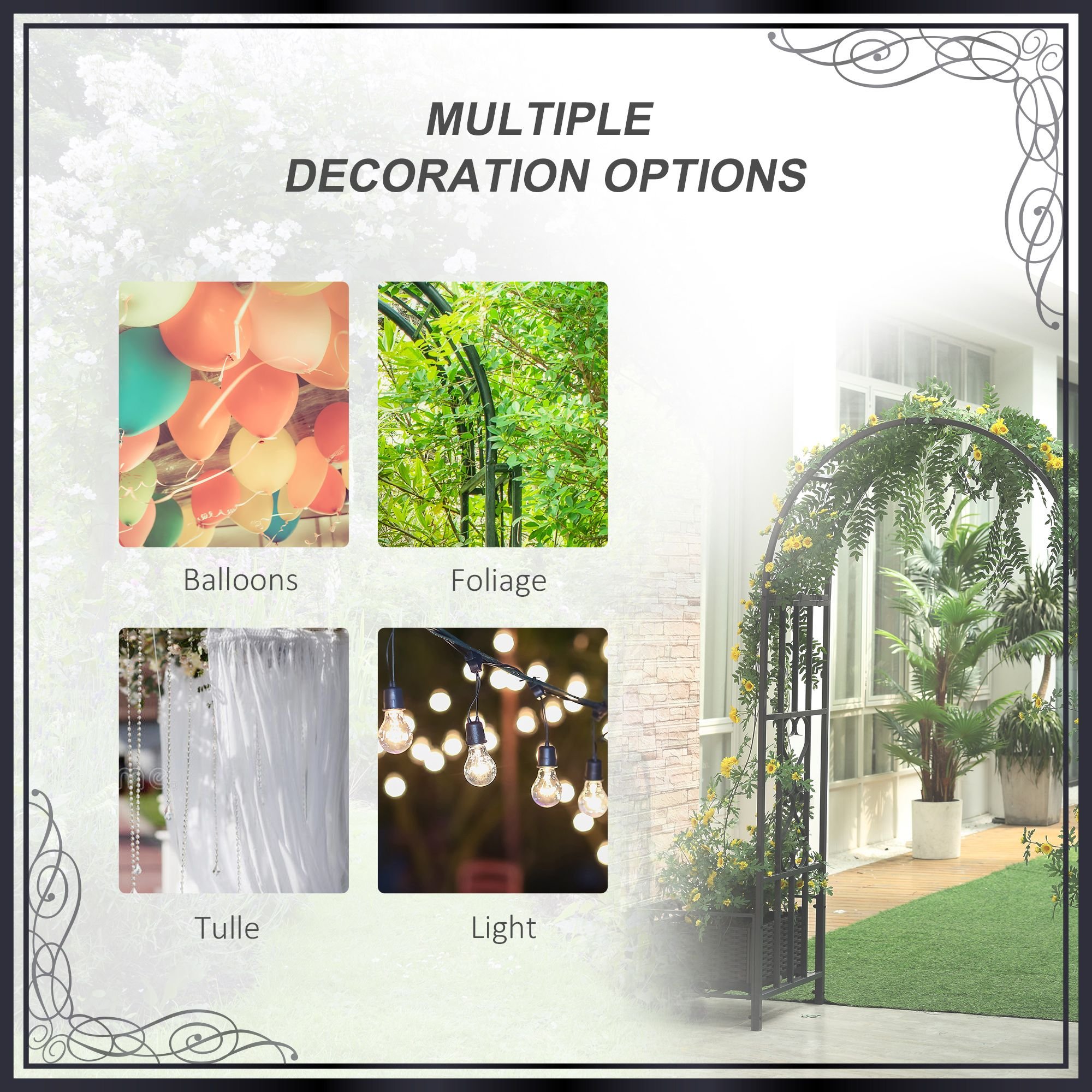 Decorative & Garden Use: You can use our garden arch gate as an attractive trellis for grape vines and other climbing plants outside, or decorate it with balloons, flowers, or lights, for weddings and other events anywhere.