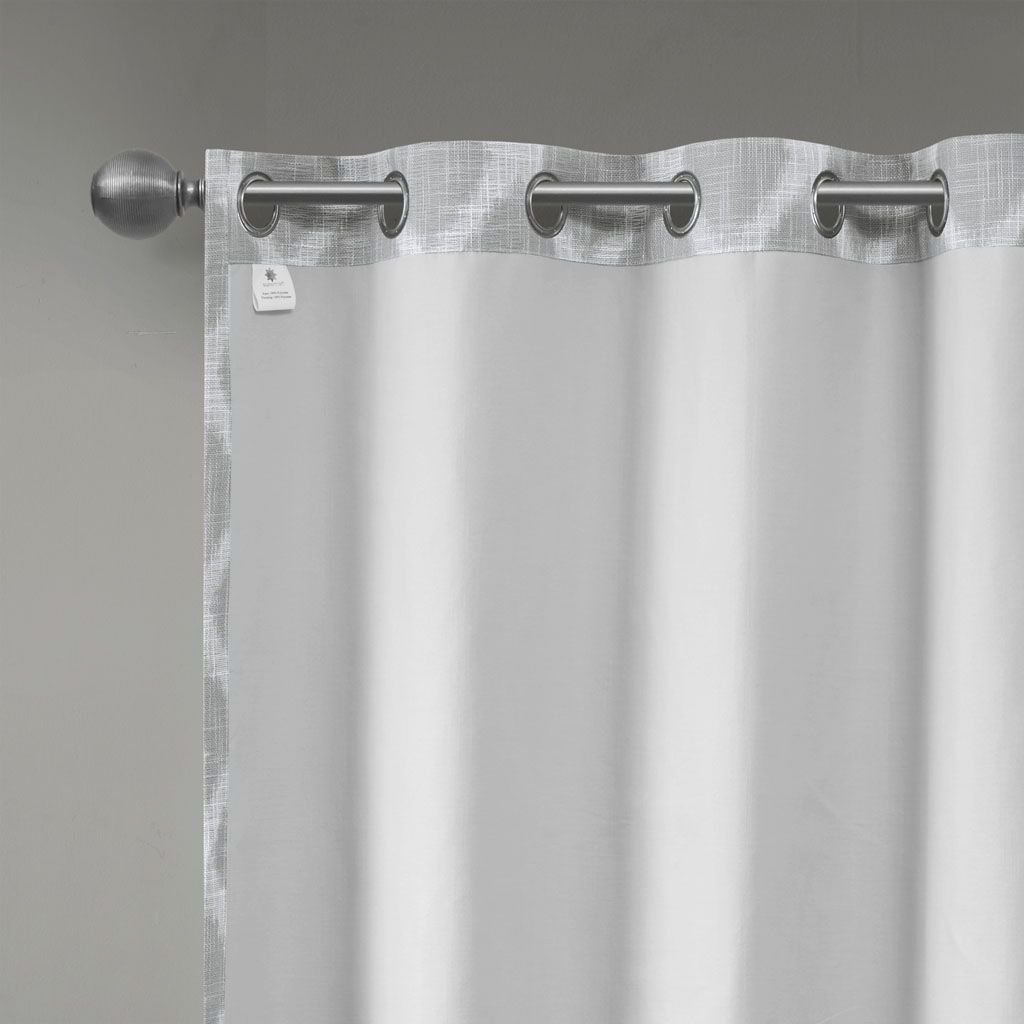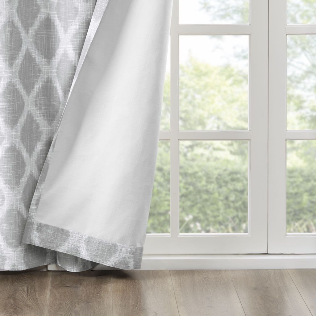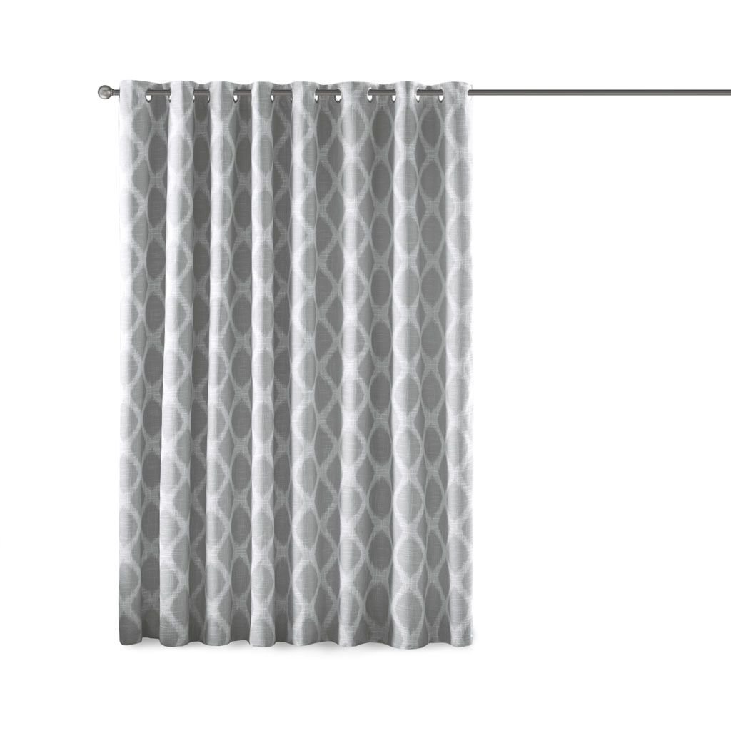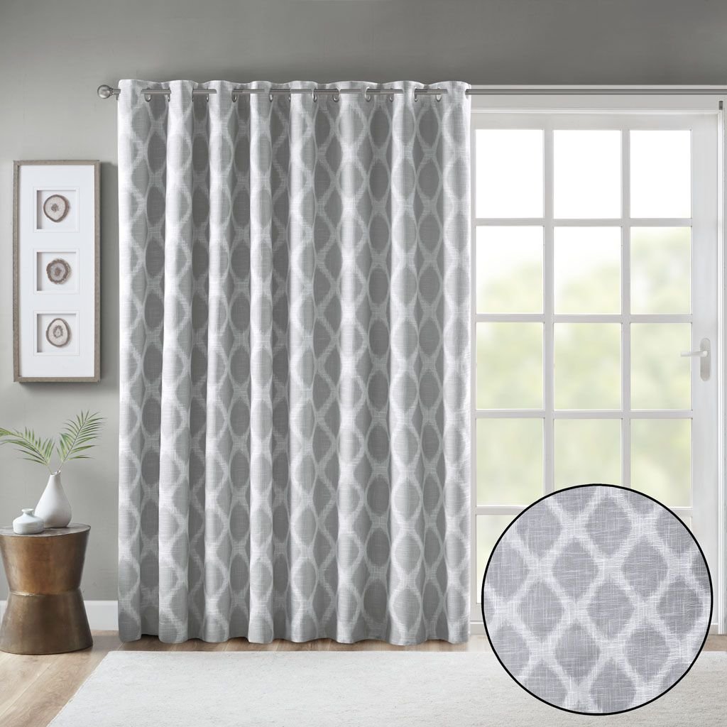 Introducing a modern and stylish take on energy efficiency, our SunSmart Blakesly Printed Ikat Blackout Patio Panel is the perfect update to any room. Fresh and chic, this patio panel features a printed grey ikat design on a textured firm base fabric, creating dimension for a cool and casual look. Finished with a two pass foamback and bonding technique, the panel is enhanced to block most sunlight and create a significant barrier to reduce outside noise. Silver grommet top detail makes it easy to hang, open, and close panels throughout the day; while fitting up to a standard 1.25' diameter rod. With considerable energy savings and a high level of added privacy, this blackout patio panel is perfect for any wide or average window space by providing full coverage with its extra width. Give your space a beautiful, one-of-a-kind update with this contemporary blackout patio panel. Lighting level: Heavily Shaded Ambiance.