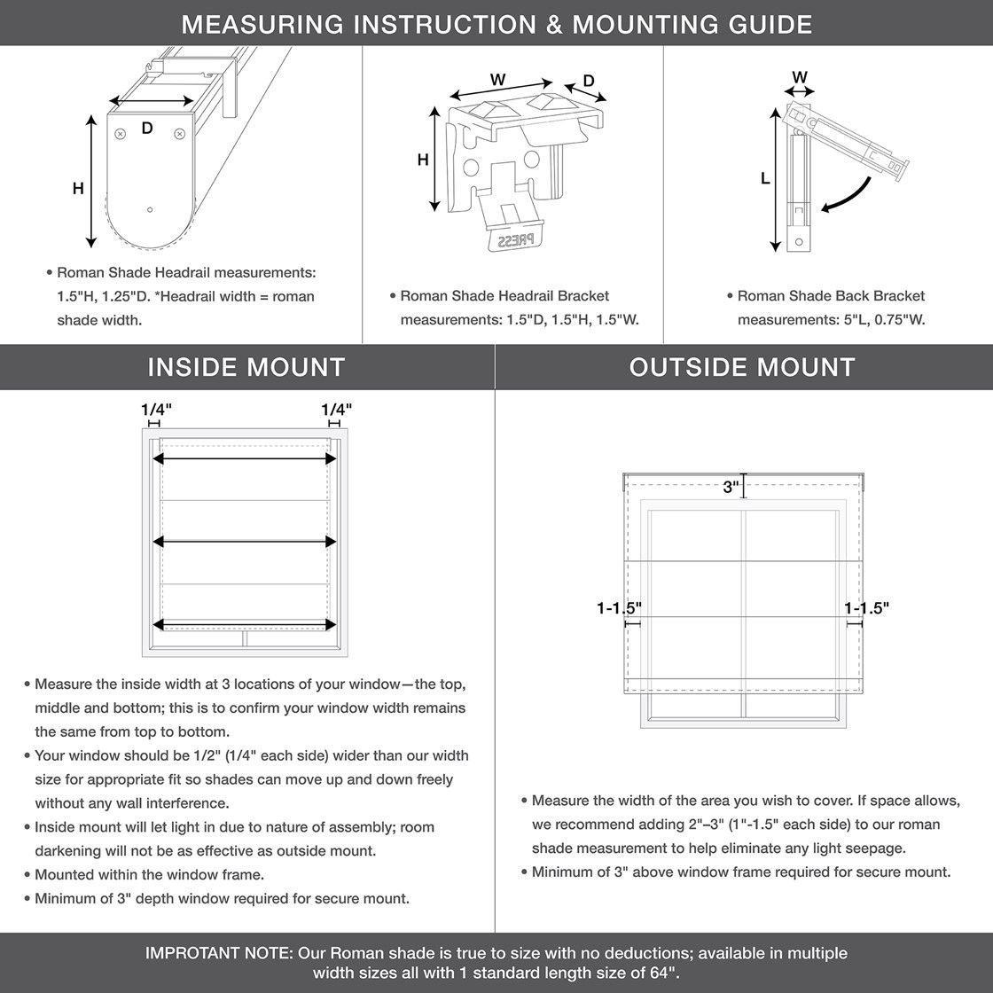 27x64"1 Roman Shade:27"W x 64"LHead Rail:27"W x 1.61"D x 1.13"HRecommend Mounting Depth:1.75"