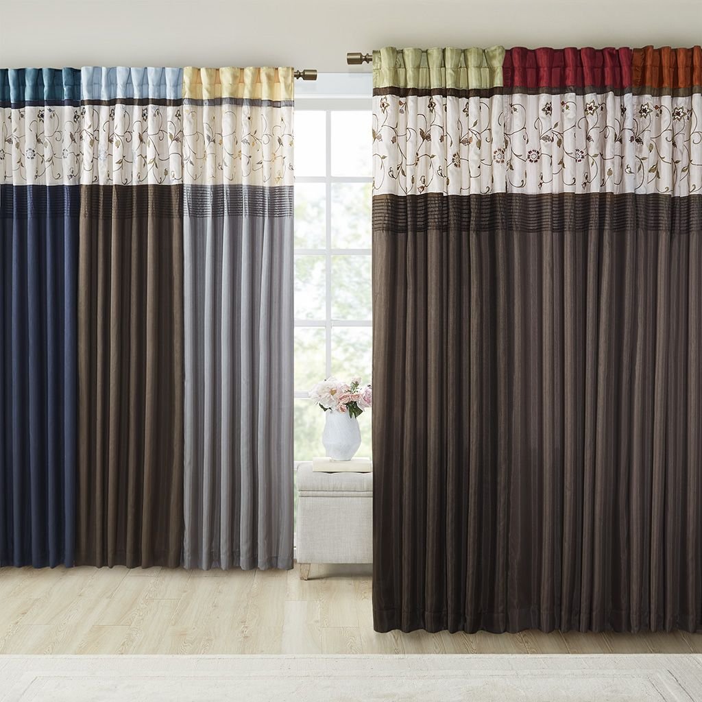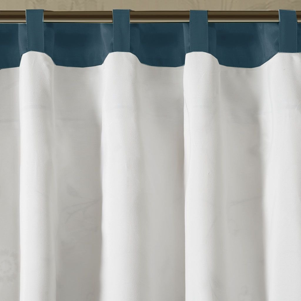 The Serene window panel adds a simple elegant touch to any room. The deep navy color combined with soft ivory and chocolate brown creates the perfect classic look. The panel features delicate floral embroidery and pleated details that add dimension. Added lining helps to filter light and provide some room darkening features. Panel is made with 3" rod pocket as well as back tabs; fits up to 1.25" diameter rod.