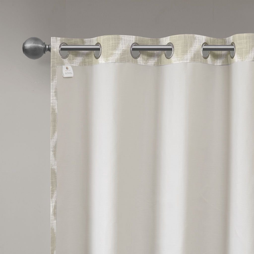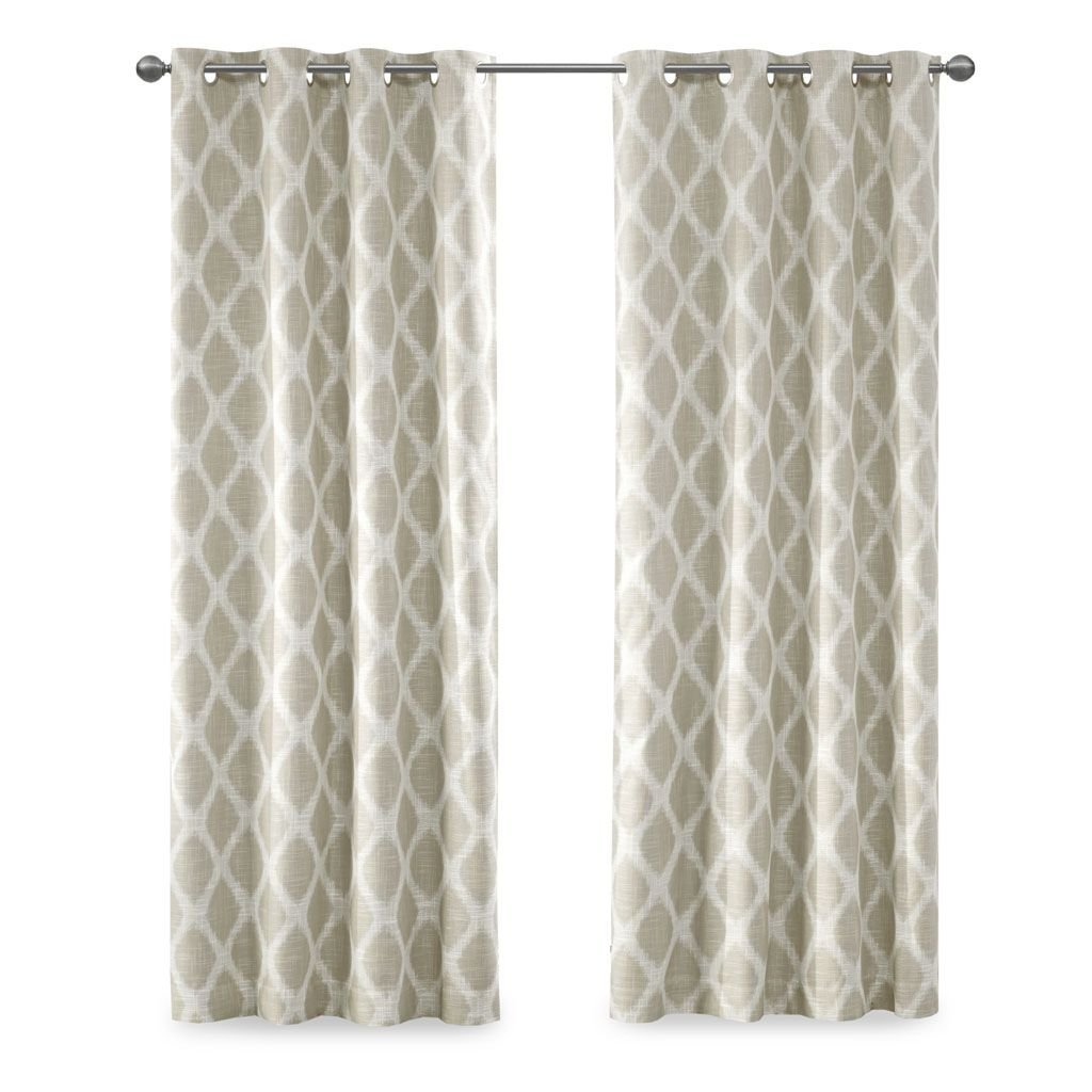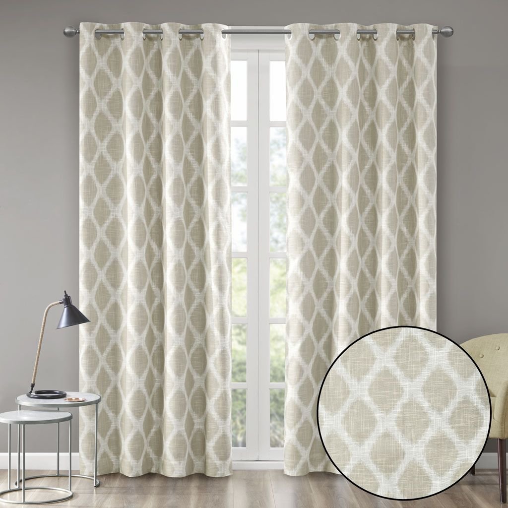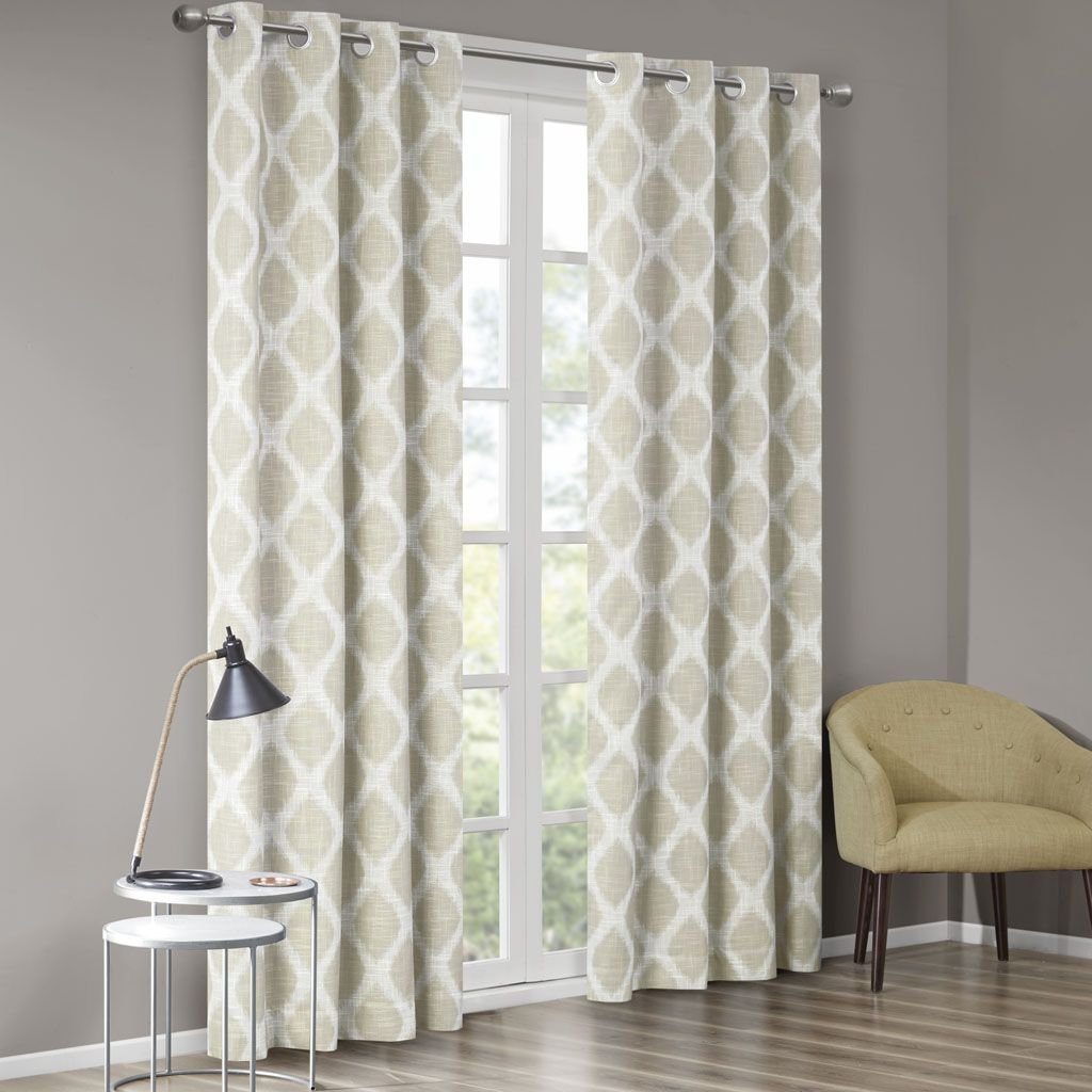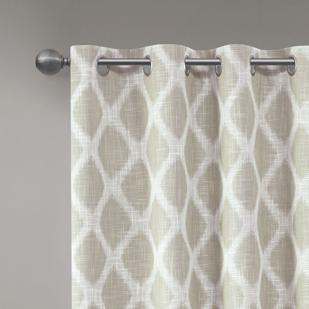 Introducing a modern and stylish take on energy efficiency, our SunSmart Blakesly Printed Ikat Blackout Panel is the perfect update to any room. Fresh and chic, this window panel features a printed taupe ikat design on a textured firm base fabric, creating dimension for a cool and casual look. Finished with a two pass foamback and bonding technique, the panel is enhanced to block most sunlight and create a significant barrier to reduce outside noise. Silver grommet top detail makes it easy to hang, open, and close panels throughout the day; while fitting up to a standard 1.25' diameter rod. With considerable energy savings and a high level of added privacy, this blackout panel is perfect for home offices, family rooms, and bedrooms. Give your space a beautiful, one-of-a-kind update with this contemporary blackout window panel. Lighting level: Heavily Shaded Ambiance.