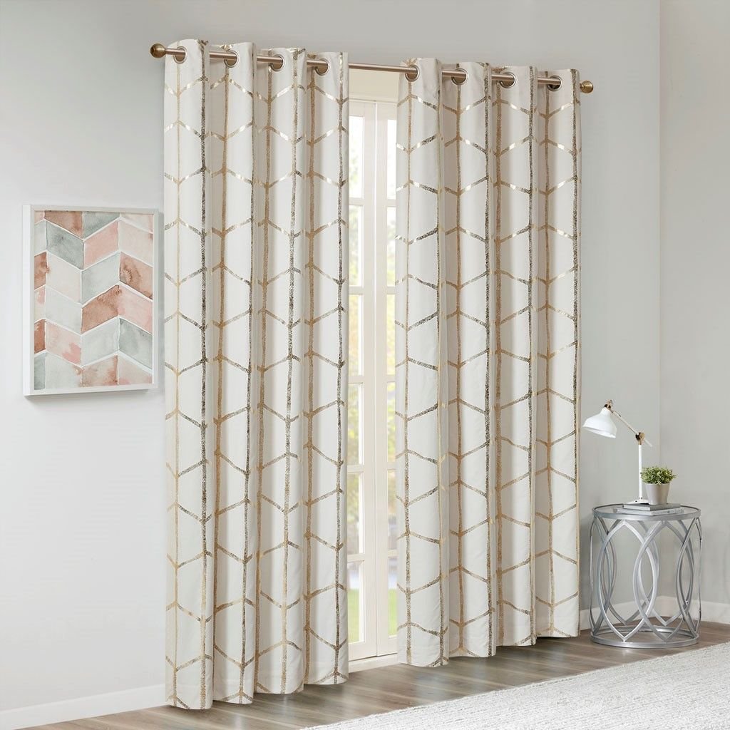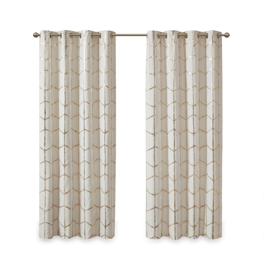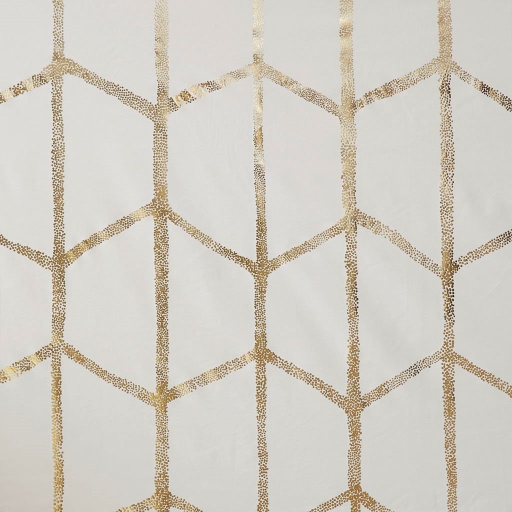 Freshen up your space with the enchanting style of Intelligent Design Raina Window Panel. The stunning panel flaunts a geometric, metallic gold print against a soft ivory ground for a fun and eye-catching look! Finished with a heavy 3 pass foamback liner, this panel is 100% total blackout providing energy efficiency and added privacy. Grommet top makes this panel easy to hang, open, and close through the day. Machine washable for easy care; complete the collection with coordinating bedding and shower curtain sold separately.