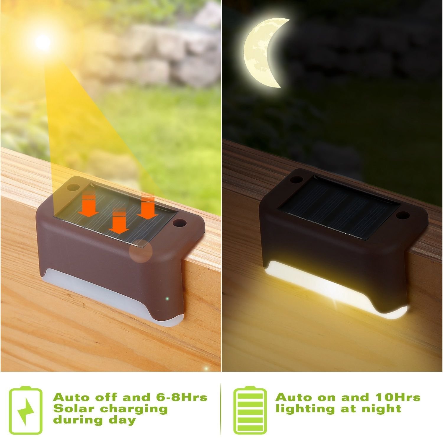 **10HRS RUNTIME*:Come with rechargeable Ni-CD battery; 6-8Hrs fully absorb sunlight and sustains 10Hrs illumination. Never feel pitch darkness when you climb the steps at front door or garden.