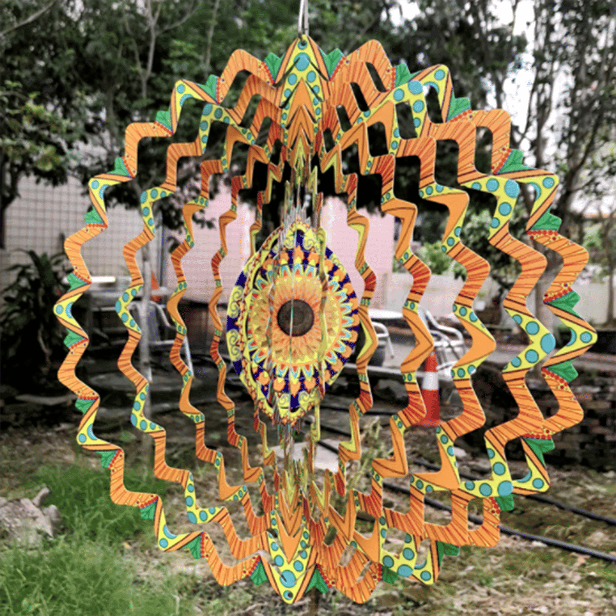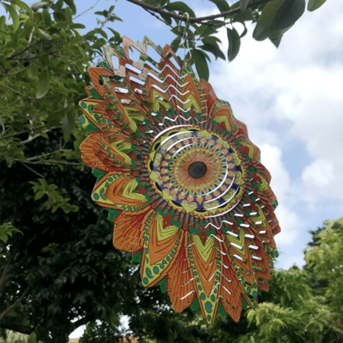 [KINETIC ART]- Add these mystical colours and motion to any garden with this intricately designed, laser cut metal spinning art. Kinetic art spins in the breeze to bring out beautiful design patterns.